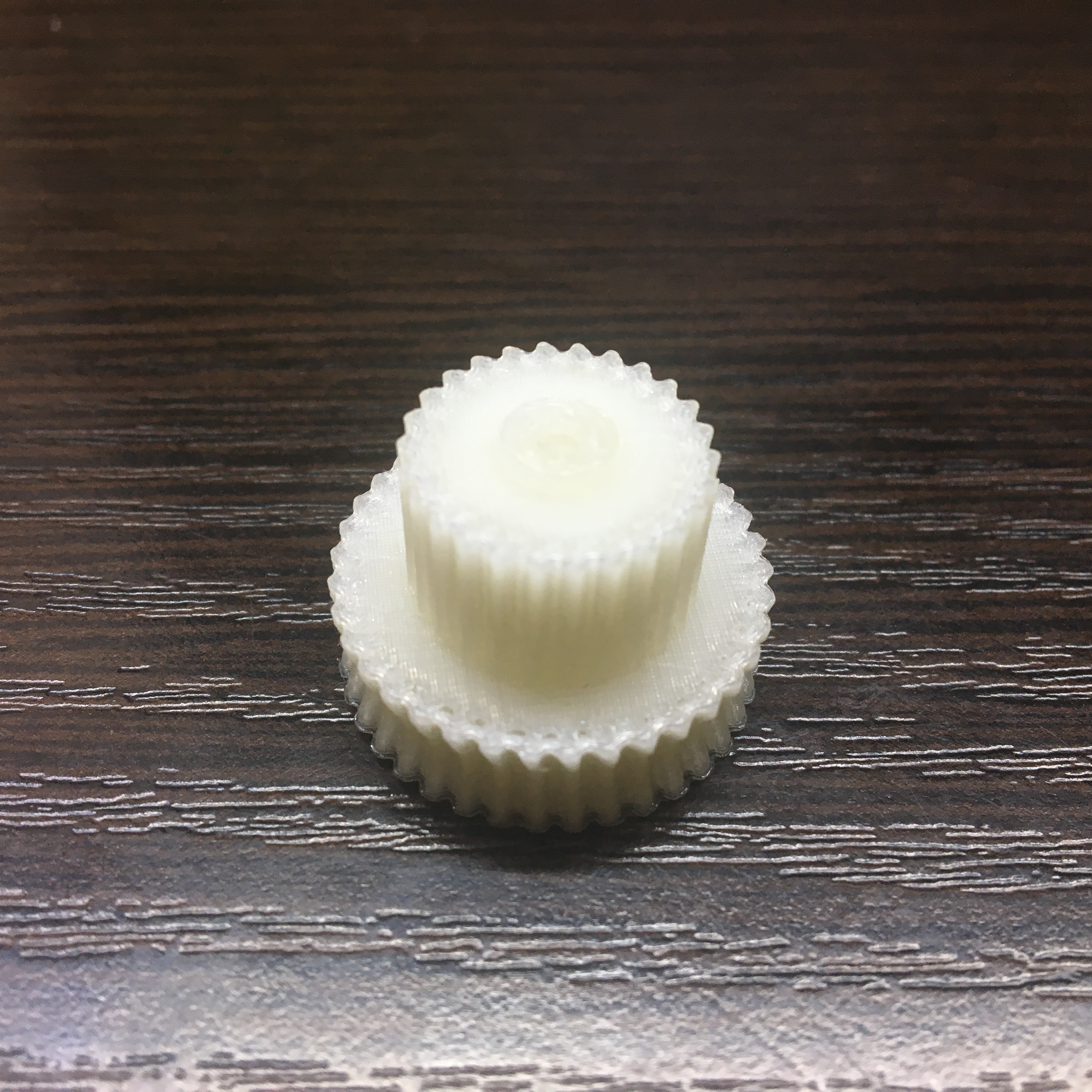 Напечатали еще одну шестерню редуктора для ламинатора PHOTONEX@-325Digital. Материал PETG, из которого выполнялась печать прошлый раз не прошел испытания на прочность. Новою версию отпечатали из нейлона, это один из самых прочных материалов на сегодняшний день для 3D печати не считая композитов.